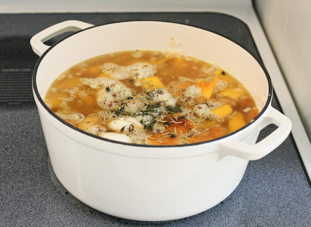- Remove from heat and puree until smooth using an immersion blender.