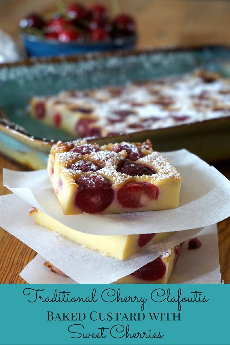 A friend stopped by to pick some cherries and mentioned that she wanted to make a cherry clafoutis (pronounced clah-foe-tee) – a traditional French dessert using her French grandmother’s recipe. This piqued my interest since so many American pie recipes call for sour cherries instead of sweet cherries, so she shared the recipe with me. How cool is that? A real old-world recipe passed down from generation to generation!