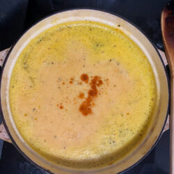 - Once the pumpkin is soft, use an immersion blender to blend the soup until smooth. Stir in the cream. Add a dash of paprika.