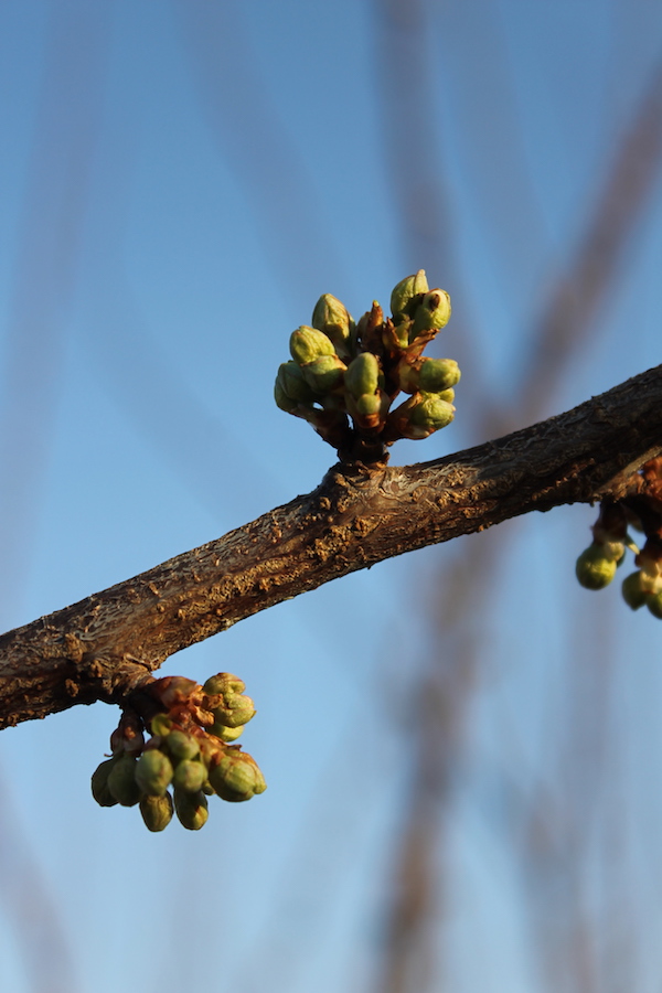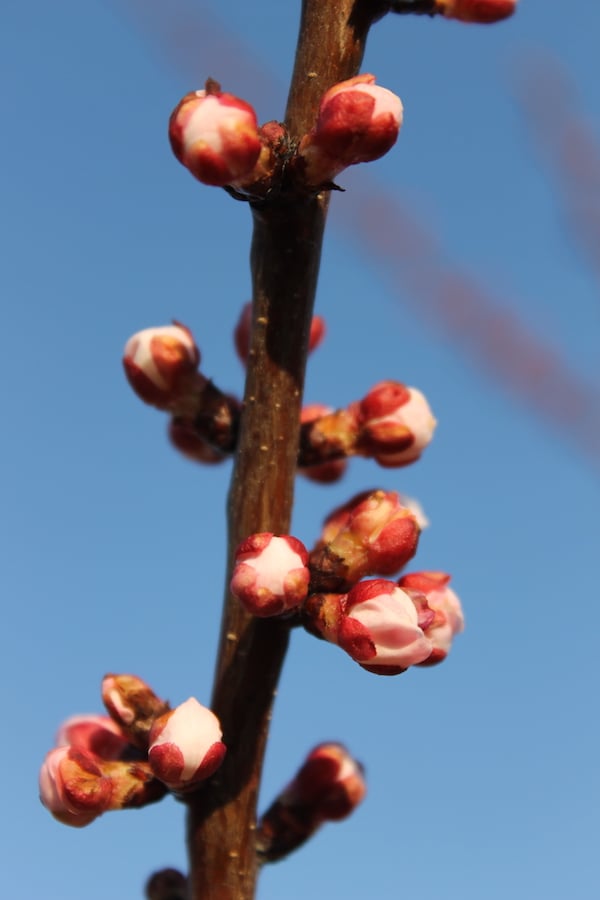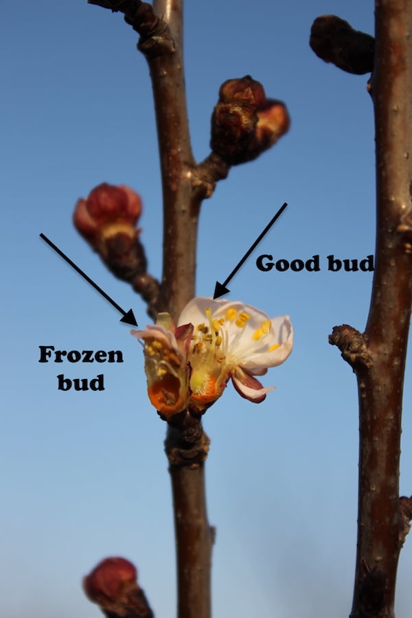 Closer to spring, the buds start to swell and move toward bloom. The sap begins to flow, the moisture content goes up—and all those things make the buds more vulnerable. In fact, some fruit is less vulnerable right after bloom than immediately beforehand. Peaches, for instance, can survive cold better when they have green fruit than when they are just blooming.