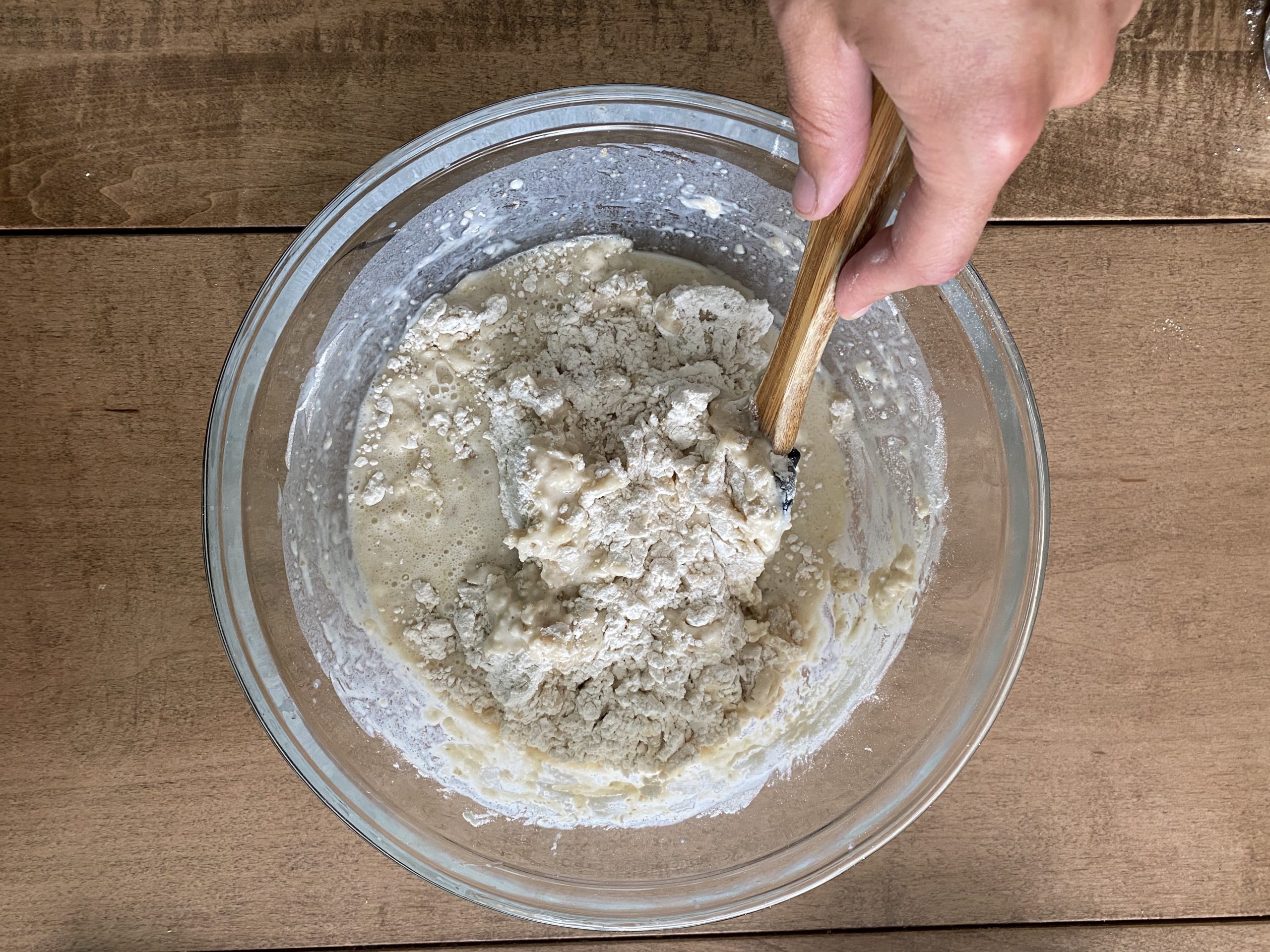 - Add 4 cups (500 g) of flour to the milk mixture and stir with a wooden spoon or rubber spatula until just combined. Be sure not to overwork the dough.