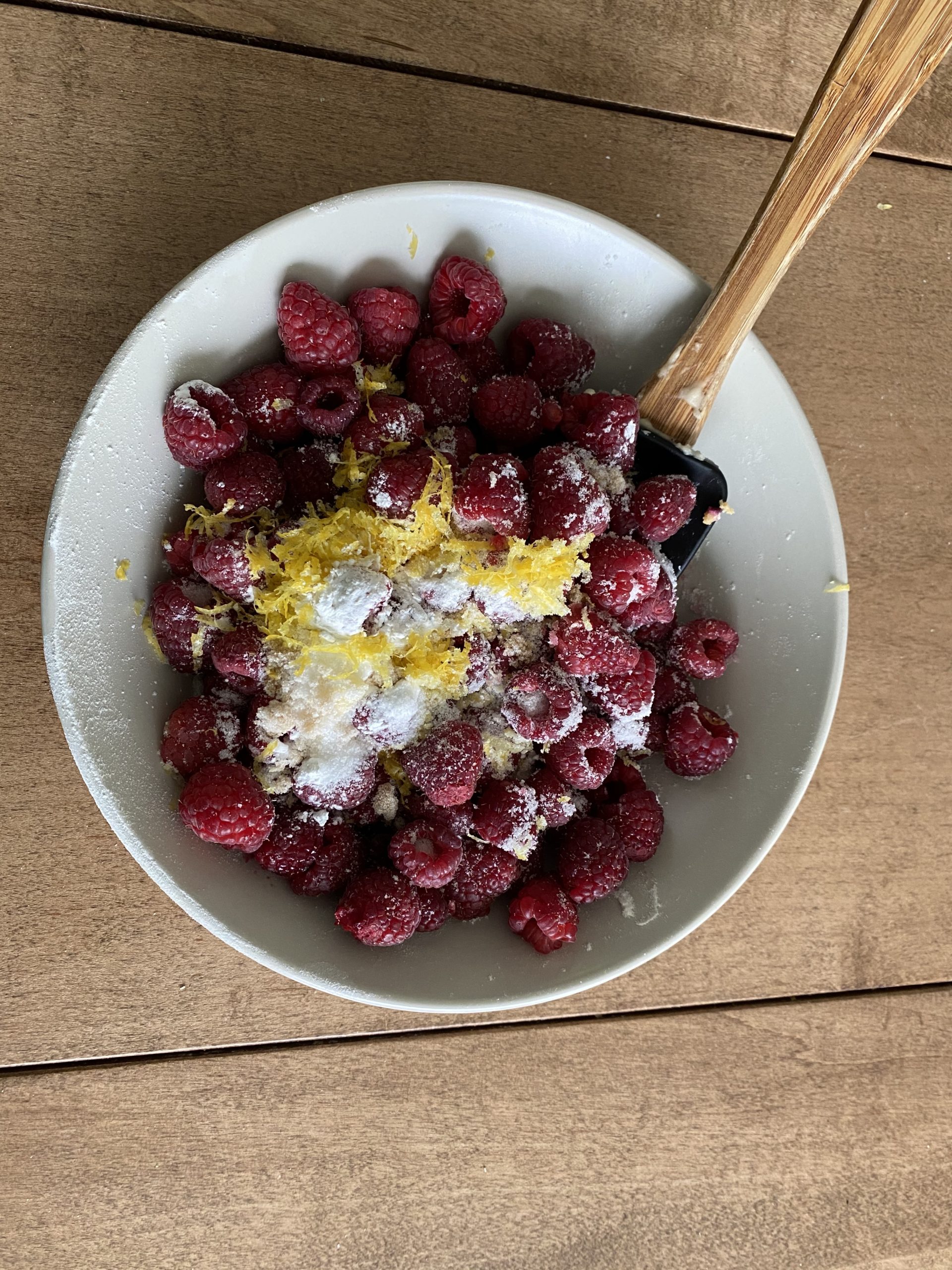 - In the last 5 minutes of the rise, using a medium bowl, combine the granulated sugar, raspberries, lemon zest and corn starch.