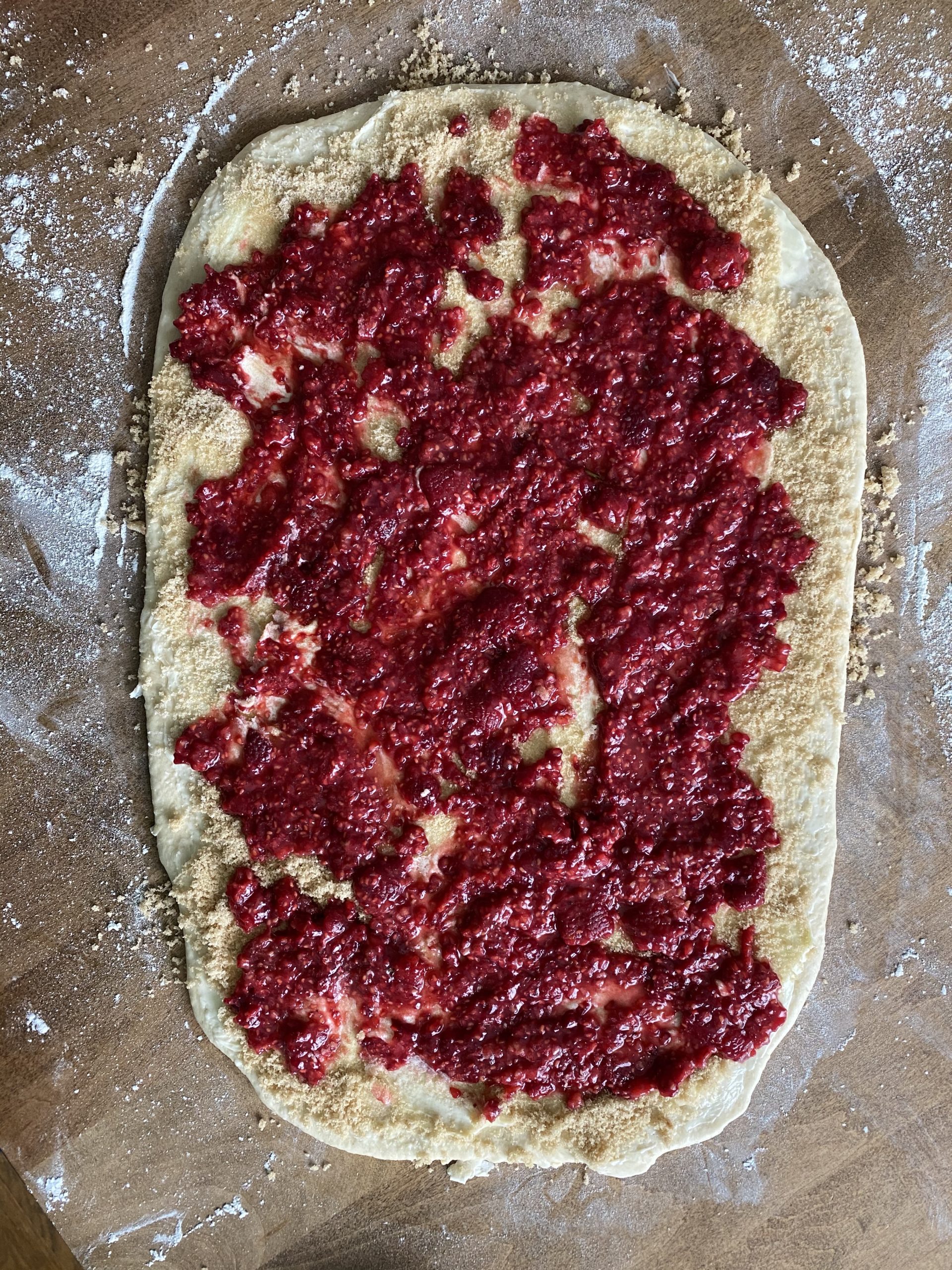 - Spread the softened butter over the entire dough rectangle, followed by the raspberry filling.